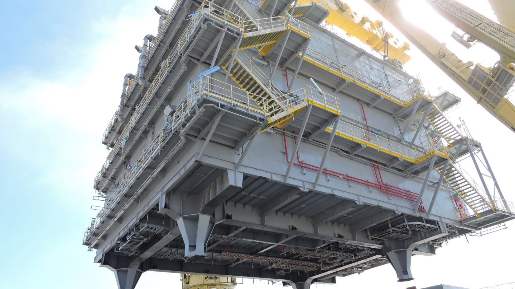 Foram necessárias 43 operações ao todo, com guindastes próprios e a grua Mammoet, que é uma das maiores do mundo e tem uma capacidade de elevação de até 3.600 toneladas